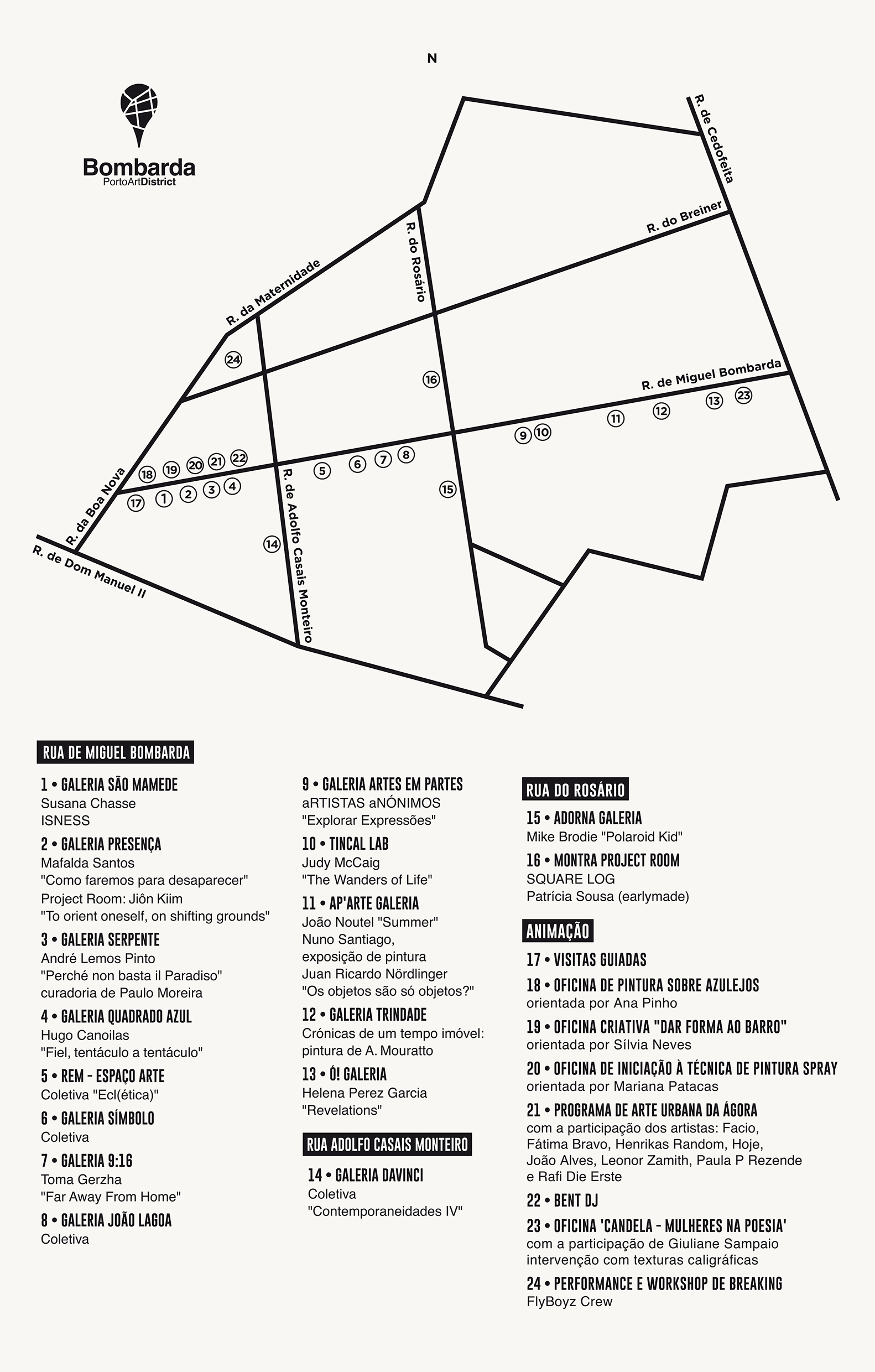 Na zona pedonal entre a Rua de Miguel Bombarda e a Rua de Cedofeita, destaque para a Oficina criativa de poesia 'Candela - Mulheres na Poesia', com a participação da artista e designer gráfica Giuliane Sampaio que irá realizar uma intervenção com texturas caligráficas sobre papel. O acesso é aberto a todas as idades.