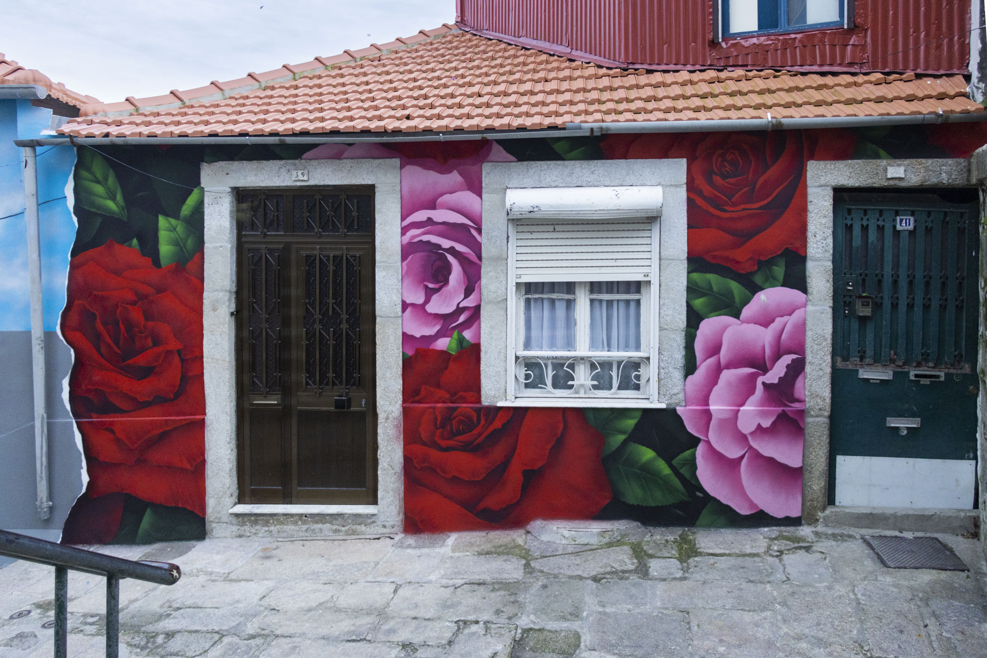 Decidiu “rasgar” a parede em vários retalhos, como uma “banda de desenhos” que revelam a sua cidade. “Dividi o mural em diferentes focos, com destaque para a palavra ‘Porto’, onde as pessoas se podem sentar e tirar a fotografia que irão levar como ‘souvenir’”. Mas não se ficou por aqui: convocou as flores típicas, como um jardim que vive “todo o ano, com rosas e camélias”, e pintou um rosto, de dimensões gigantescas, a quem poderia chamar, simplesmente, Porto.