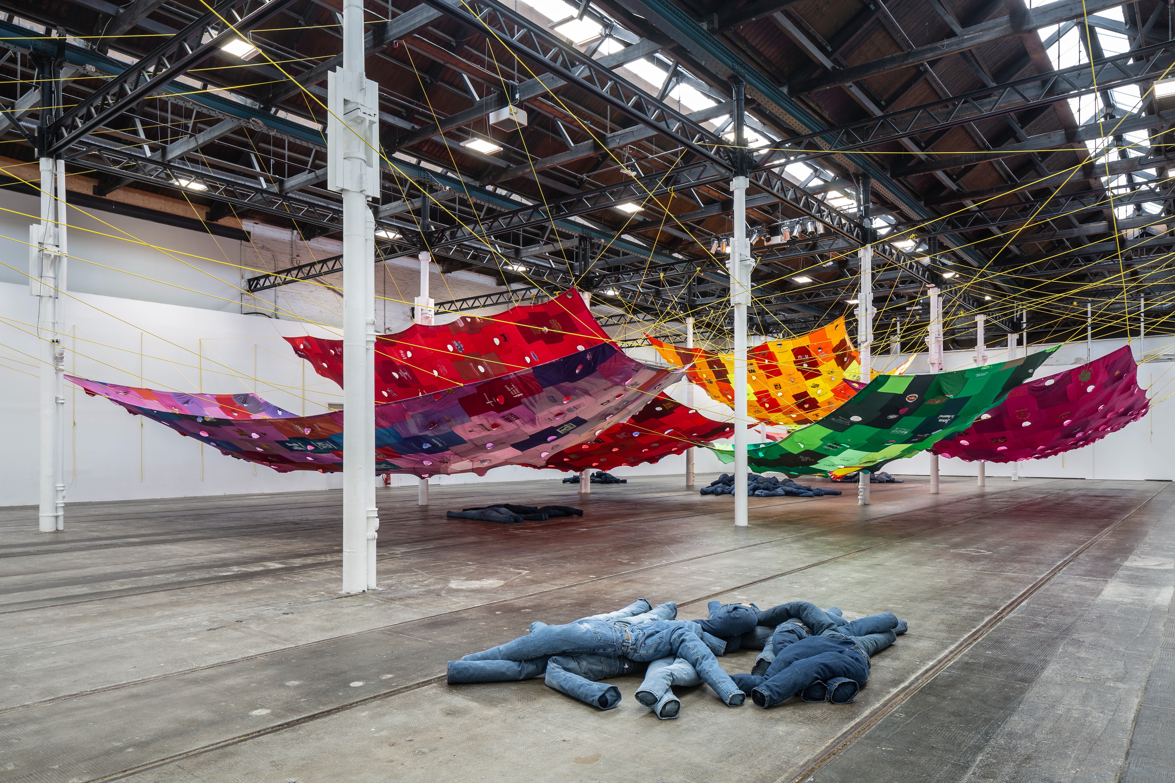 Natural do México, Pia Camil é uma artista multidisciplinar, com trabalho que abrange pintura, escultura, performance e instalações de grande escala, envolvendo frequentemente a participação do público e práticas de construção comunitária e troca direta, como é o caso deste projeto desenvolvido para a GMP. Intitulado “Partilhar”, é composto por duas peças distintas: “Bara, Bara, Bara”, uma escultura interativa construída a partir de t-shirts cosidas juntas, e “Vicky’s Blue Jeans Hammock”, criada a partir das calças de ganga recolhidas.