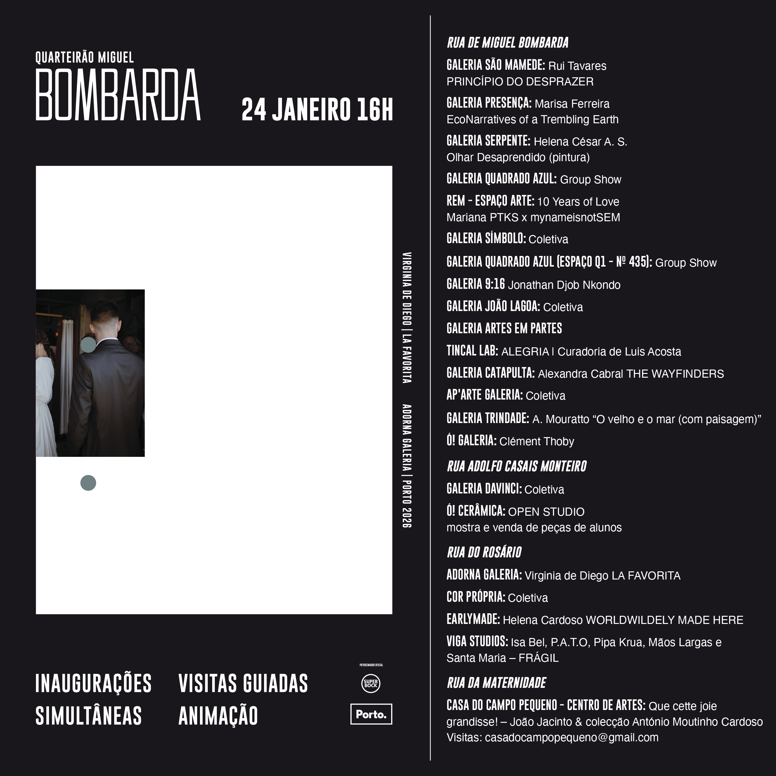 Tal como acontece em todas as Inaugurações Simultâneas, alunos de Artes Visuais da Escola Superior de Educação vão orientar duas visitas guiadas por alguns dos espaços de Bombarda. A primeira é às 16h00 e a segunda às 17h30, cada uma com 15 vagas: os interessados devem enviar o seu nome e o horário pretendido para visitasguiadasbombarda@agoraporto.pt até às 13h00 de 23 de janeiro. As visitas contarão com interpretação em língua gestual portuguesa.